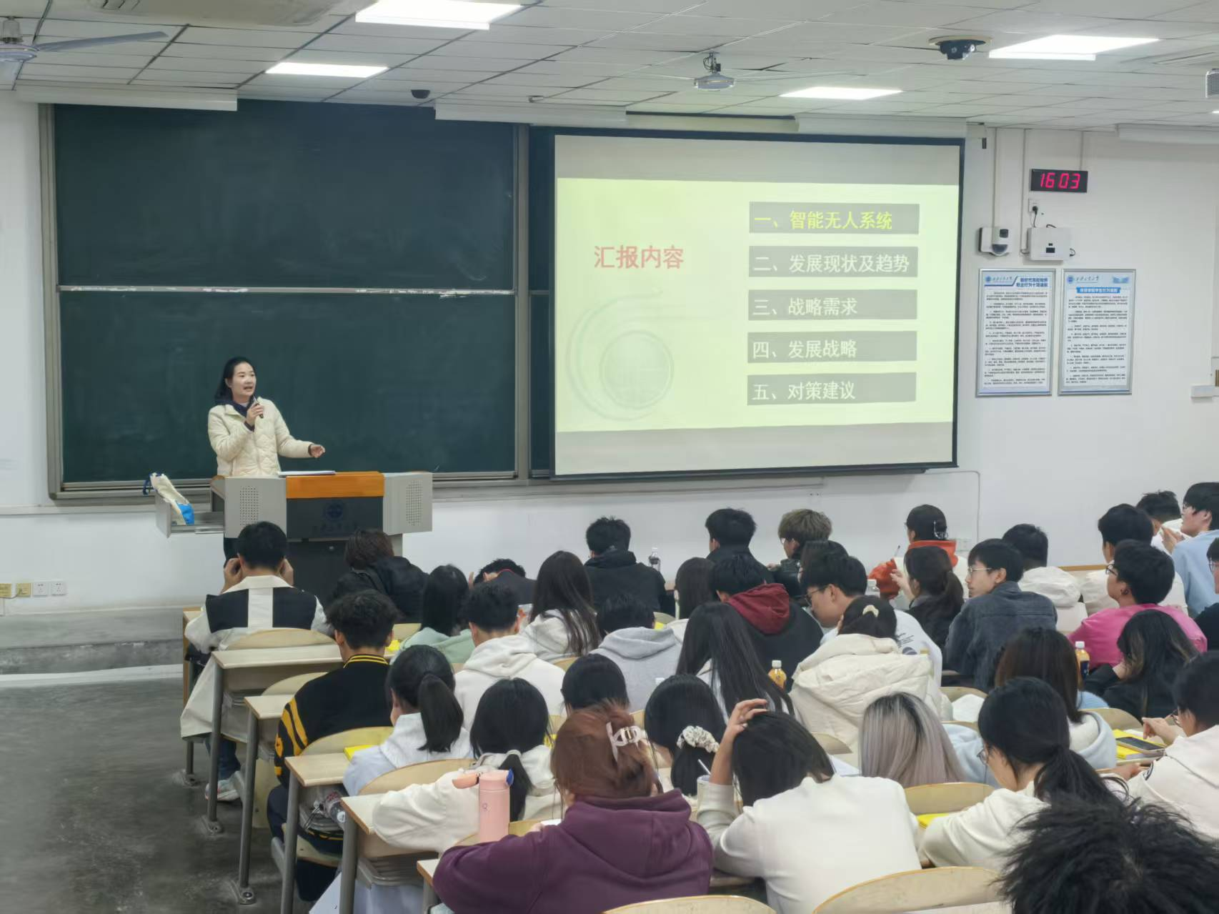 劉露從智能無人系統(tǒng)定義、發(fā)展現(xiàn)狀及趨勢(shì)、戰(zhàn)略需求、發(fā)展戰(zhàn)略以及對(duì)策建議五個(gè)方面展開,深入淺出地介紹了智能無人系統(tǒng)的前沿動(dòng)態(tài)及其在國防現(xiàn)代化與國民經(jīng)濟(jì)建設(shè)中的戰(zhàn)略價(jià)值與應(yīng)用前景。從國家戰(zhàn)略需求的高度,分析了該領(lǐng)域未來所面臨的機(jī)遇與挑戰(zhàn),闡釋了兵器科學(xué)與智能無人技術(shù)深度融合的未來趨勢(shì),激發(fā)同學(xué)們對(duì)專業(yè)前沿的探索欲和投身國防科技事業(yè)的使命感。