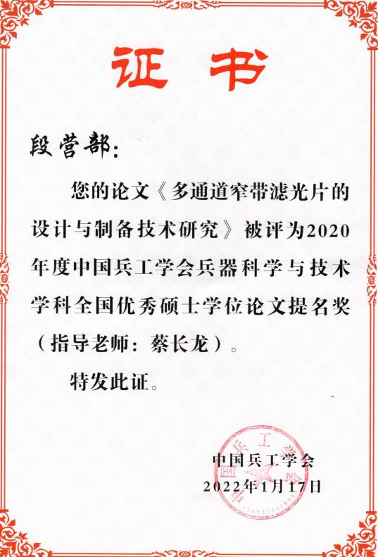 2022年1月17日,中國兵工學(xué)會公布了第五屆兵器科學(xué)與技術(shù)學(xué)科全國優(yōu)秀博士、碩士學(xué)位論文評選結(jié)果。本次評選共評出19篇優(yōu)秀學(xué)位論文及提名獎,其中優(yōu)秀博士學(xué)位論文4篇,優(yōu)秀博士學(xué)位論文提名獎4篇,優(yōu)秀碩士學(xué)位論文10篇,優(yōu)秀碩士學(xué)位論文提名獎1篇。我校兵器科學(xué)與技術(shù)學(xué)科碩士生段營部的碩士學(xué)位論文“多通道窄帶濾光片的設(shè)計與制備技術(shù)研究”榮獲優(yōu)秀碩士學(xué)位論文提名獎,這是我校首次獲此殊榮。