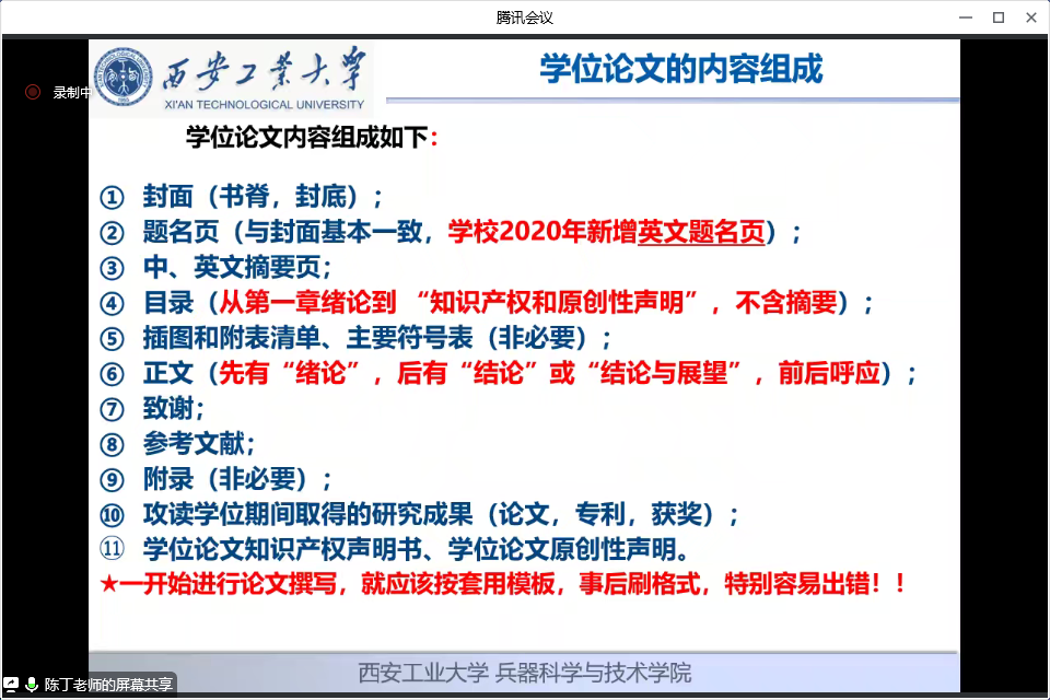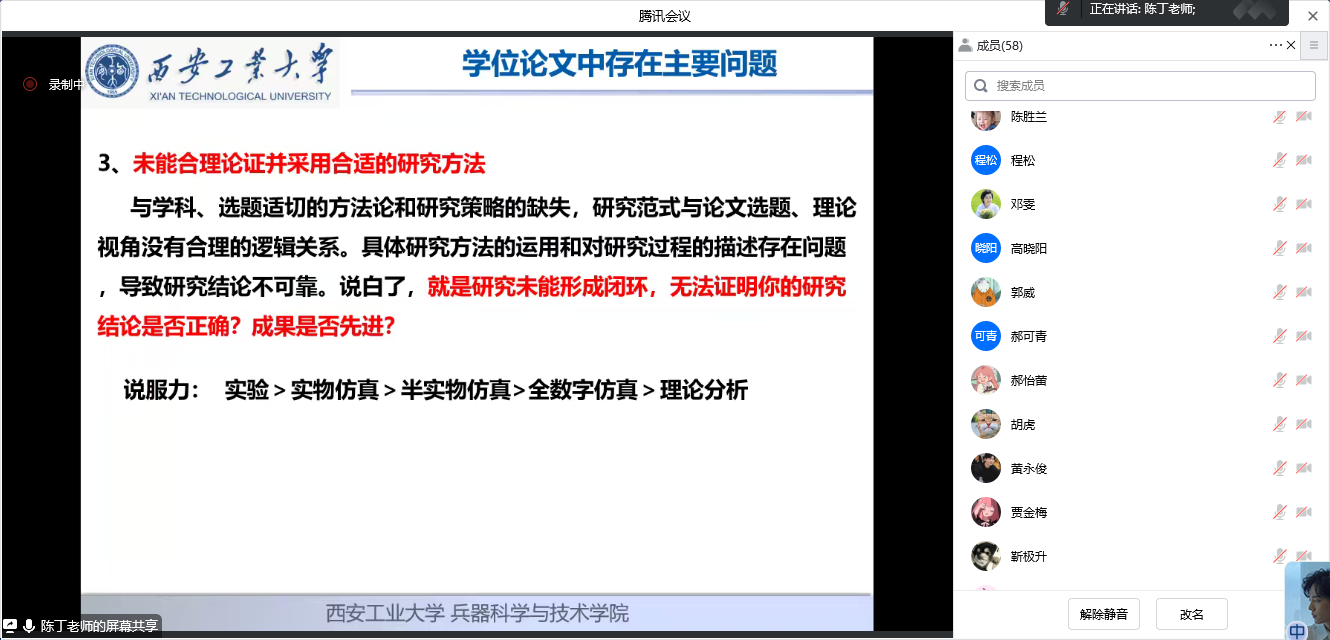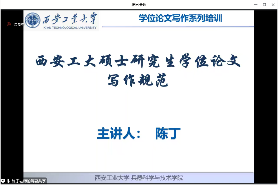 講座題目:西安工大碩士研究生學(xué)位論文寫作規(guī)范,主講人:陳丁,博士、高級工程師、碩士生導(dǎo)師。主要研究方向:兵器數(shù)字化試驗(yàn)測試技術(shù)、雷達(dá)系統(tǒng)總體設(shè)計(jì)與建模。中國電子學(xué)會高級會員、中國儀器儀表學(xué)會高級會員、IEEE會員,多個SCI及中文核心期刊評審專家。發(fā)表學(xué)術(shù)論文90余篇,其中SCI、EI收錄20余篇。多次獲得相關(guān)學(xué)術(shù)會議、科技成果獎。