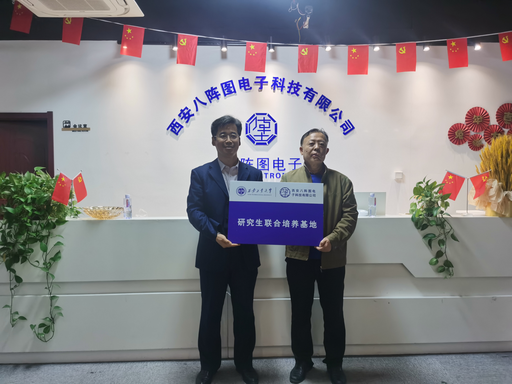 隨后,郭永春院長一行前往西安八陣圖電子科技有限公司進行交流、參觀,由該公司總工程師朱亞鵬,總體部負責人董吉印負責接待。校企雙方就軍民融合、科研合作、人才培養(yǎng)等方面開展深入探討。會后,雙方舉行“西安工業(yè)大學和西安八陣圖電子科技有限公司研究生聯(lián)合培養(yǎng)基地”授牌儀式。