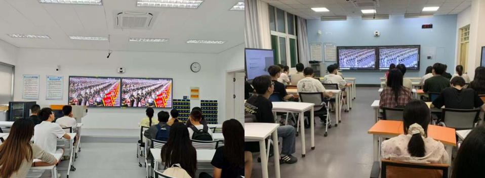 教室里、會議廳內(nèi),氣氛莊嚴(yán)而熱烈,師生們早早來到會場,等待閱兵式的開始。56門禮炮80響轟鳴展現(xiàn)大國威儀,師生全體起立,在莊嚴(yán)肅穆的國歌中目光堅定地注視著屏幕中的五星紅旗冉冉升起。閱兵式上,隨著“分列式,開始!”整齊劃一的方隊、鏗鏘有力的步伐、先進(jìn)精良的武器裝備,全面展現(xiàn)了我國國防和軍隊現(xiàn)代化建設(shè)的輝煌成就,展示了國家強(qiáng)大實力和嶄新形象。觀看過程中,師生們共同見證人民軍隊的颯爽英姿與祖國的強(qiáng)盛風(fēng)采,為先烈們以錚錚鐵骨戰(zhàn)強(qiáng)敵、血以肉之軀筑長城的精神動容,更為祖國的強(qiáng)大軍事力量和國防建設(shè)成就感到驕傲。