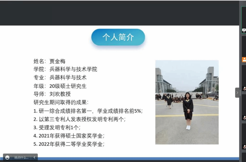 為幫助新生規(guī)劃學(xué)業(yè),解答新生在學(xué)習(xí)上的疑惑,兵器科學(xué)與技術(shù)學(xué)院于2022年9月23日19:00在線上舉辦了“國(guó)家獎(jiǎng)學(xué)金”獲得者交流報(bào)告會(huì),參會(huì)人員有研究生輔導(dǎo)員王國(guó)棟、2022級(jí)全體研究生、國(guó)家獎(jiǎng)學(xué)金獲得者賈金梅、牧迪和雷曉明。