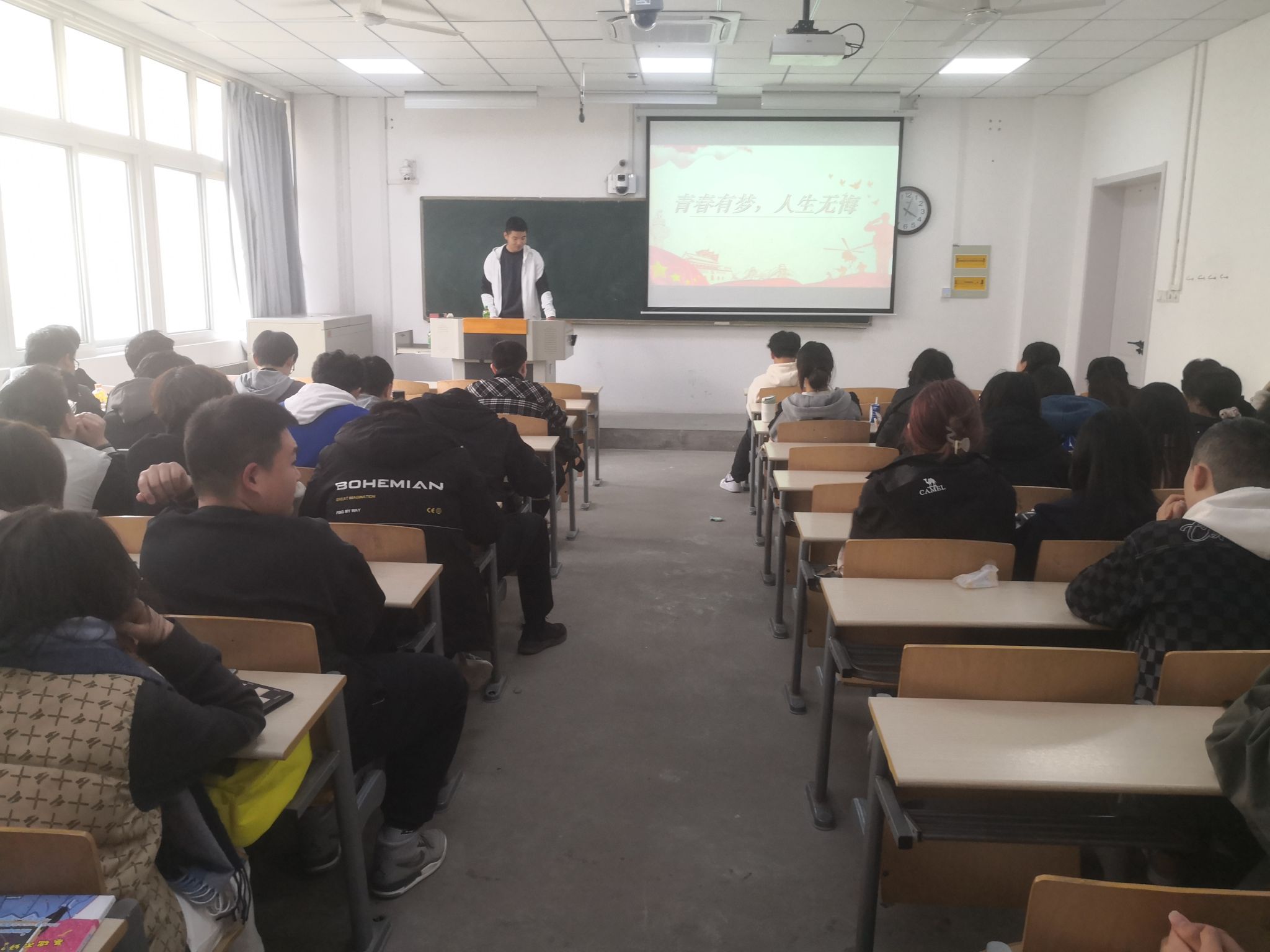 王鑫博通過視頻圖片的方式展示了自己大四畢業(yè)后在酒泉衛(wèi)星中心參軍的經(jīng)歷,講述自己參軍的感受,鼓勵有參軍想法的學(xué)生可以通過學(xué)校和當(dāng)?shù)貎蓚€途徑報名參軍。并解讀了國家近些年對大學(xué)生應(yīng)征入伍的相關(guān)政策。