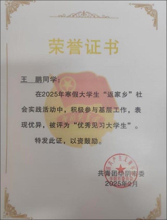 2025年寒假期間,兵器學(xué)院23級(jí)武器系統(tǒng)與工程專(zhuān)業(yè)本科生王鵬、張智超積極響應(yīng)學(xué)院以及學(xué)校關(guān)于“返家鄉(xiāng)”社會(huì)實(shí)踐的號(hào)召,分別在華陰市羅敷鎮(zhèn)政府與華陰市委統(tǒng)戰(zhàn)部實(shí)習(xí)工作。