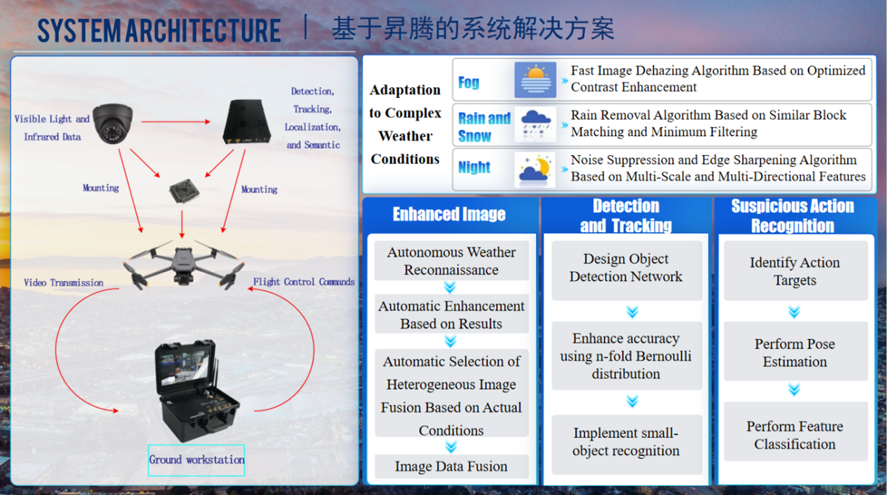 在高教主賽道國際項目中喜獲銀獎的智慧哨兵項目團(tuán)隊,由我院周清、吳杰、肖鋒、蔡長龍、王琳、劉露等幾位教師共同指導(dǎo),賈宇龍、陳漂洋等15名同學(xué)參與。該項目的Smart Sentinel是基于華為昇騰AI平臺的機載智能要地監(jiān)測系統(tǒng),針對核電站、航天發(fā)射場等重要設(shè)施面臨的低空無人機入侵威脅,通過集成光電吊艙、無人機平臺、昇騰AI模塊和地面工作站,實現(xiàn)全天候多角度實時監(jiān)控與自動化目標(biāo)檢測、跟蹤、定位及警示驅(qū)離。系統(tǒng)采用全國產(chǎn)化硬件(華為昇騰處理器)與自主算法體系,具備技術(shù)自主可控、機動性強、快速反應(yīng)、協(xié)同能力強等優(yōu)勢,可適應(yīng)復(fù)雜環(huán)境。“智慧哨兵”項目的獲獎,充分體現(xiàn)了該團(tuán)隊在前沿人工智能技術(shù)與國家重大基礎(chǔ)設(shè)施安全需求緊密結(jié)合的創(chuàng)新能力。